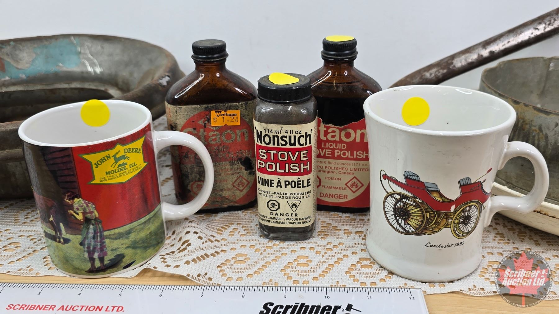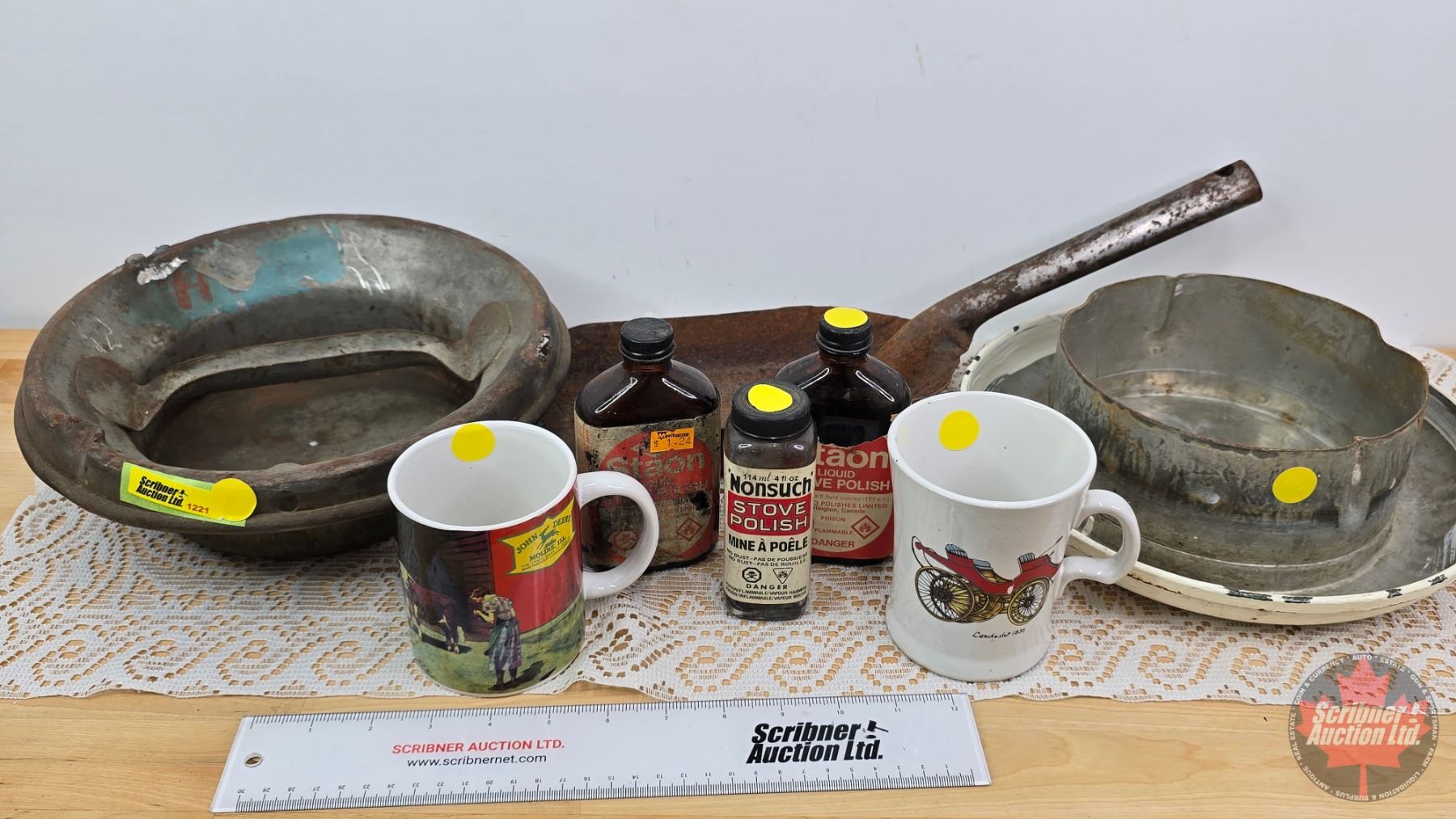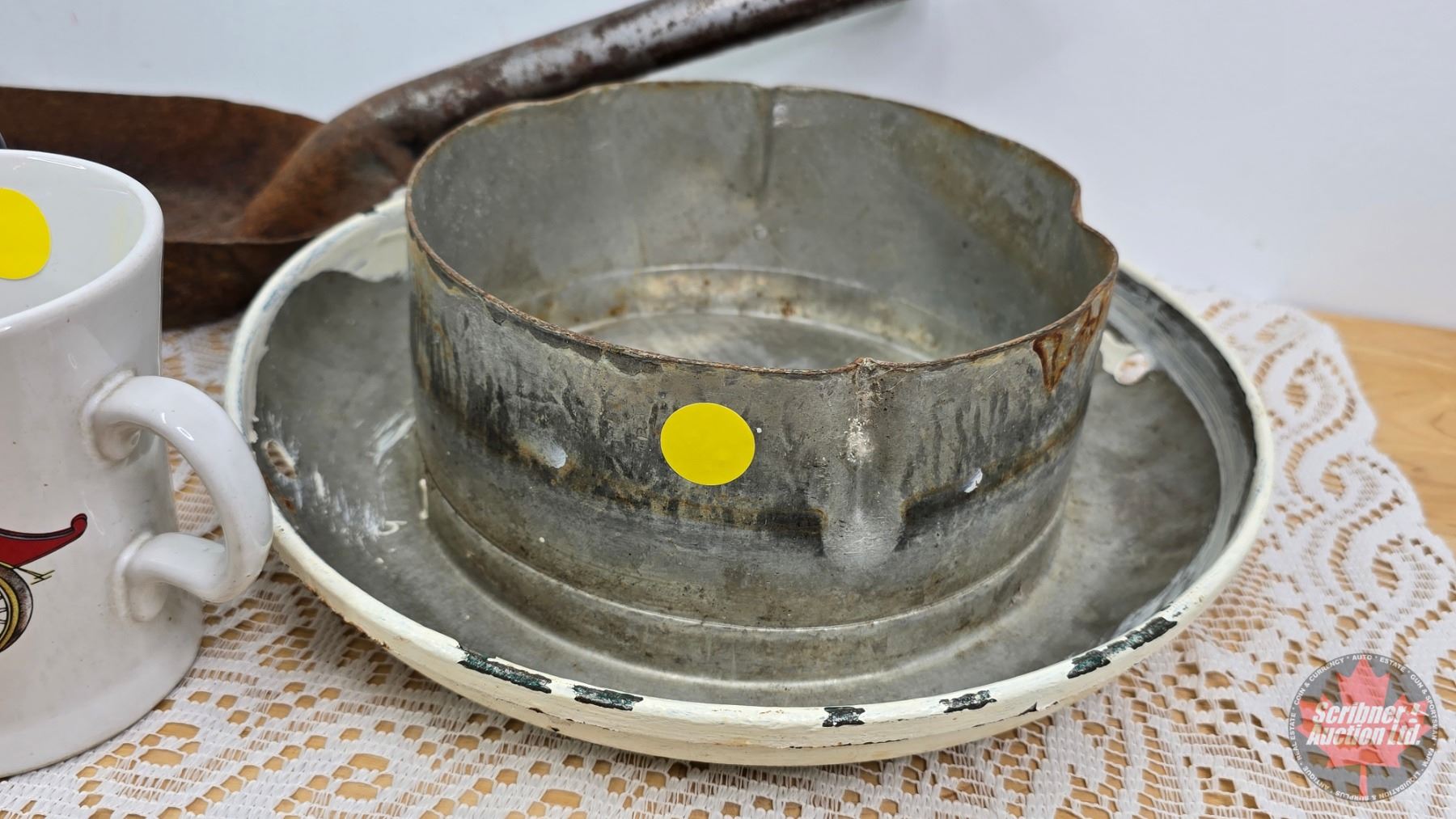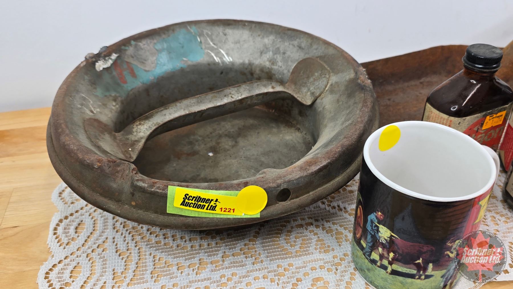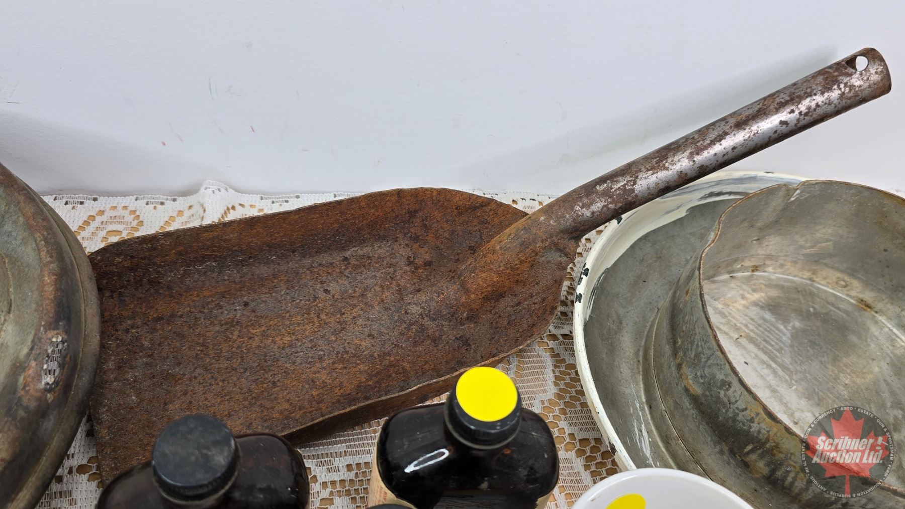 Vintage Grouping : Milk Can Lid; Scoop; Cups (2); Bottles (3); etc