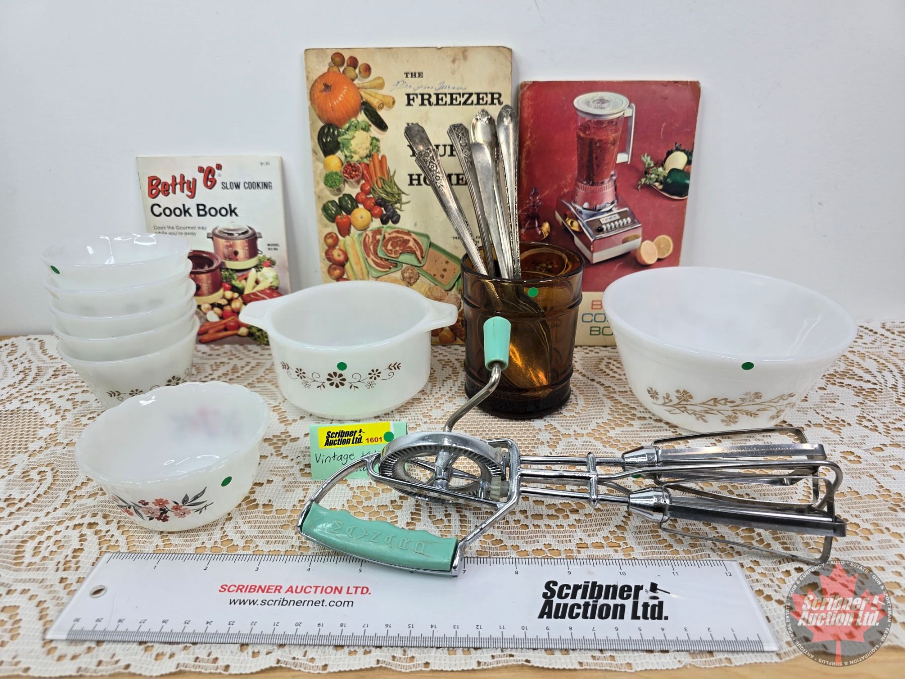 Vintage Kitchen Collector Combo : Including Fireking Bowls, Cook Books, Utensils, etc