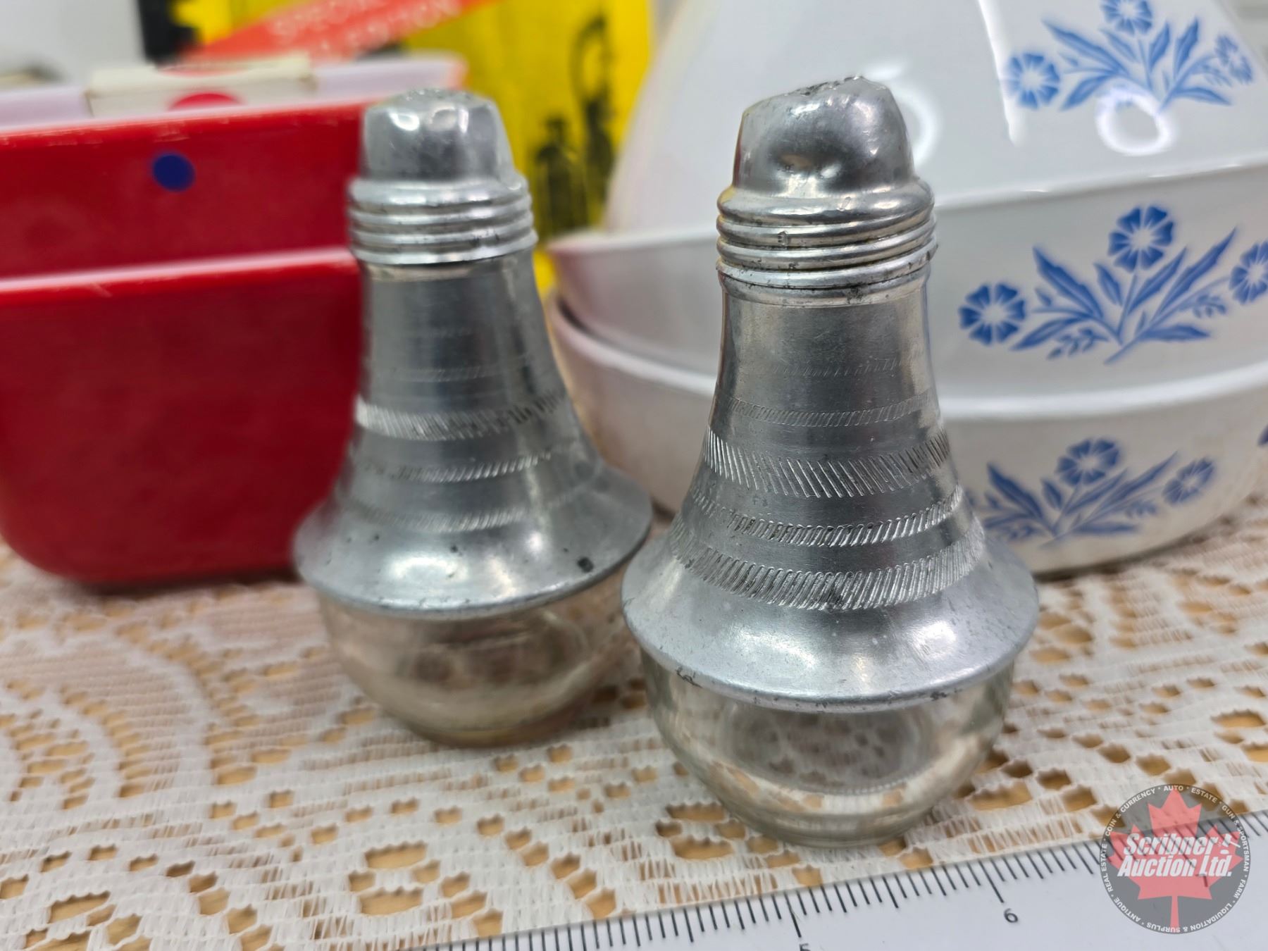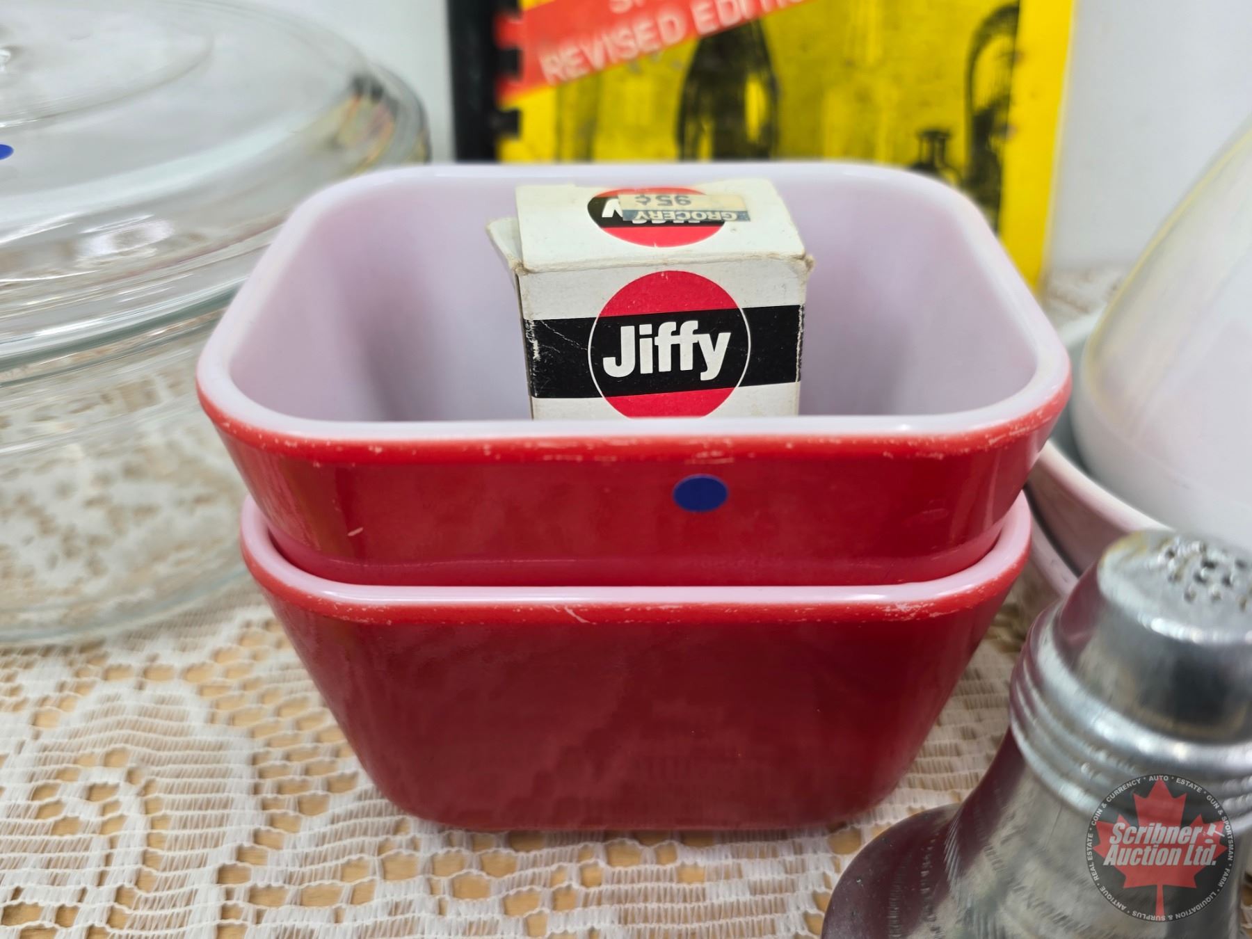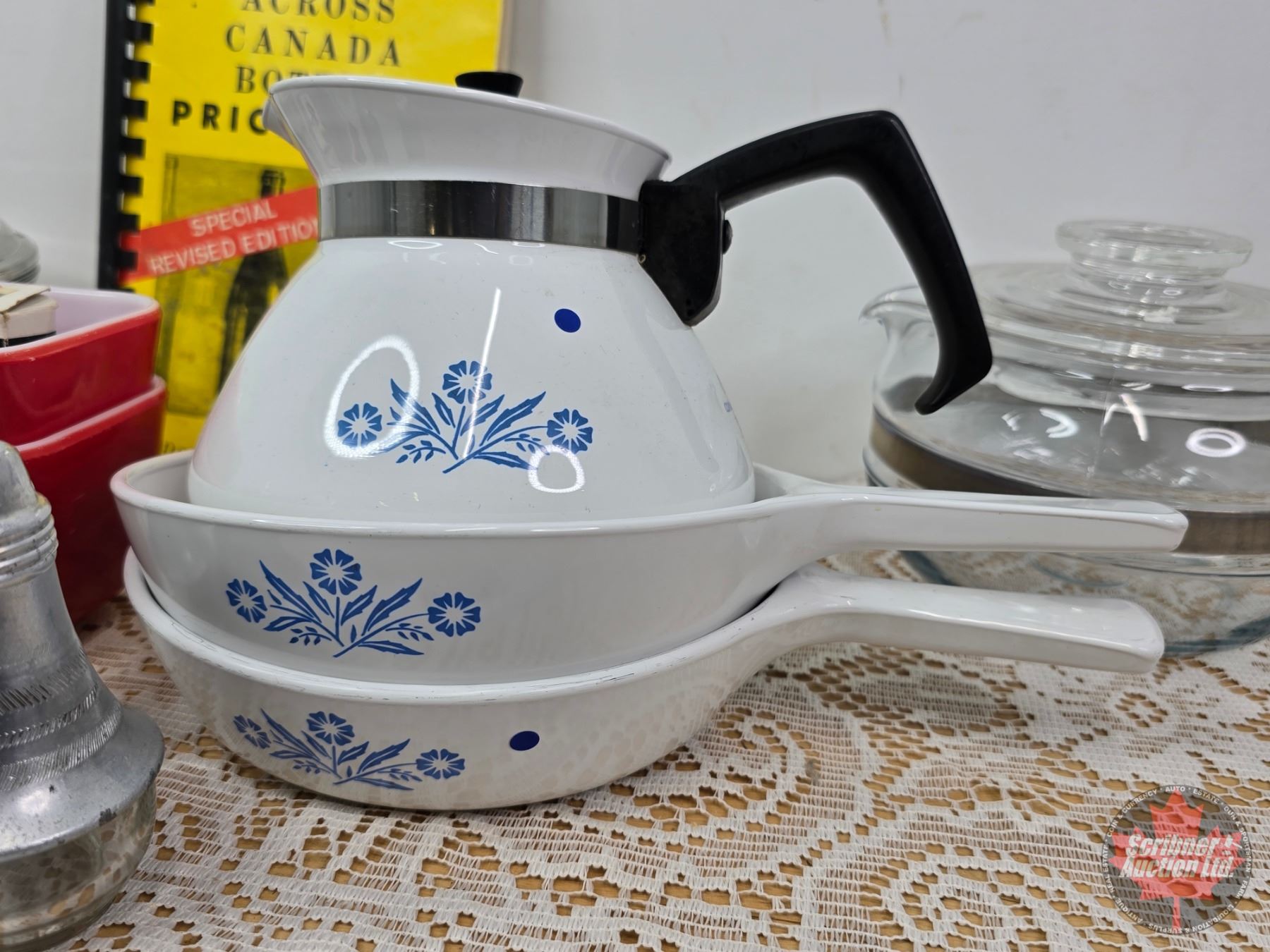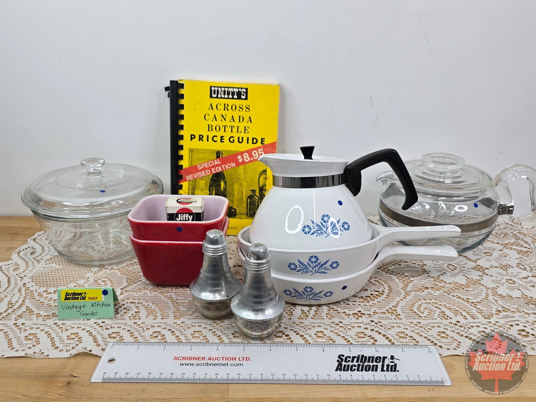 Vintage Kitchen Collector Combo including Corningware Tea Pot, Pyrex Red Refrigerator Dishes, Salt and Pepper Shakers, etc