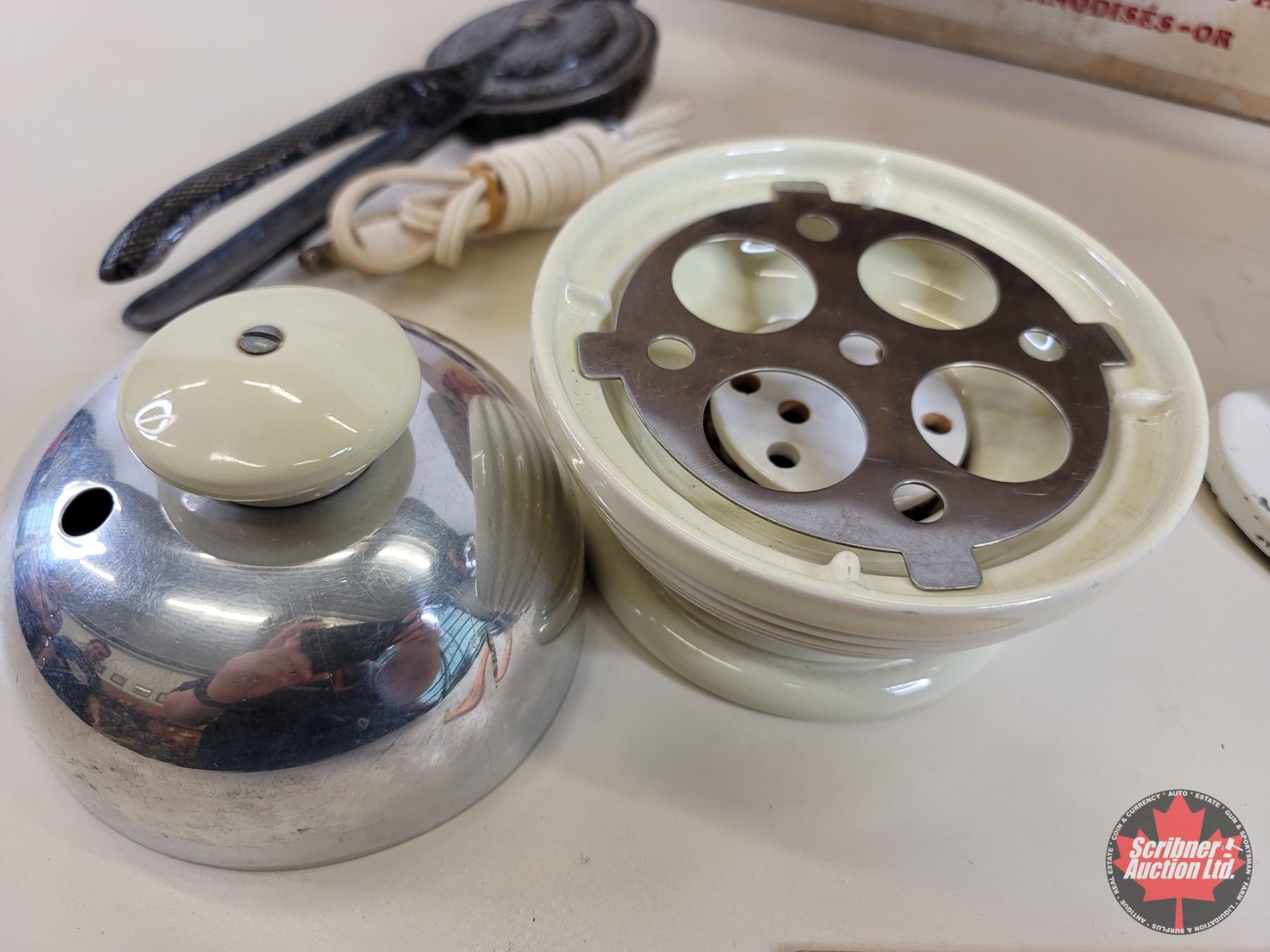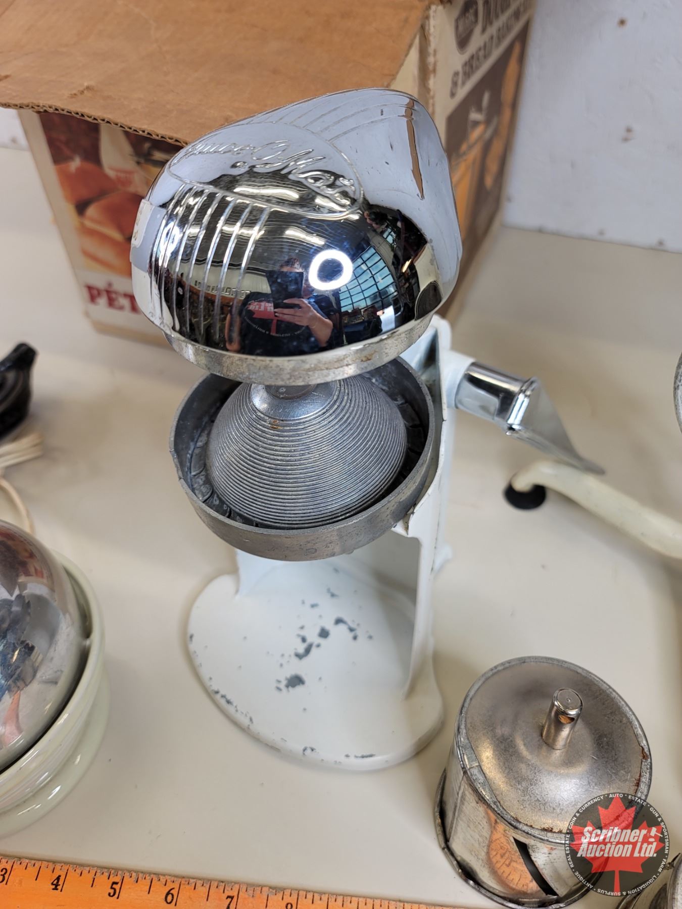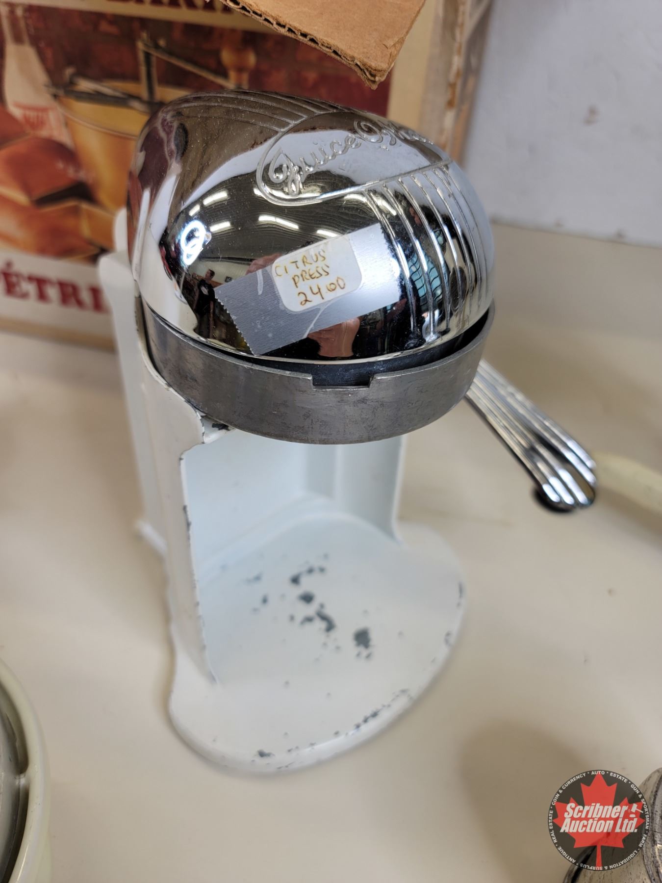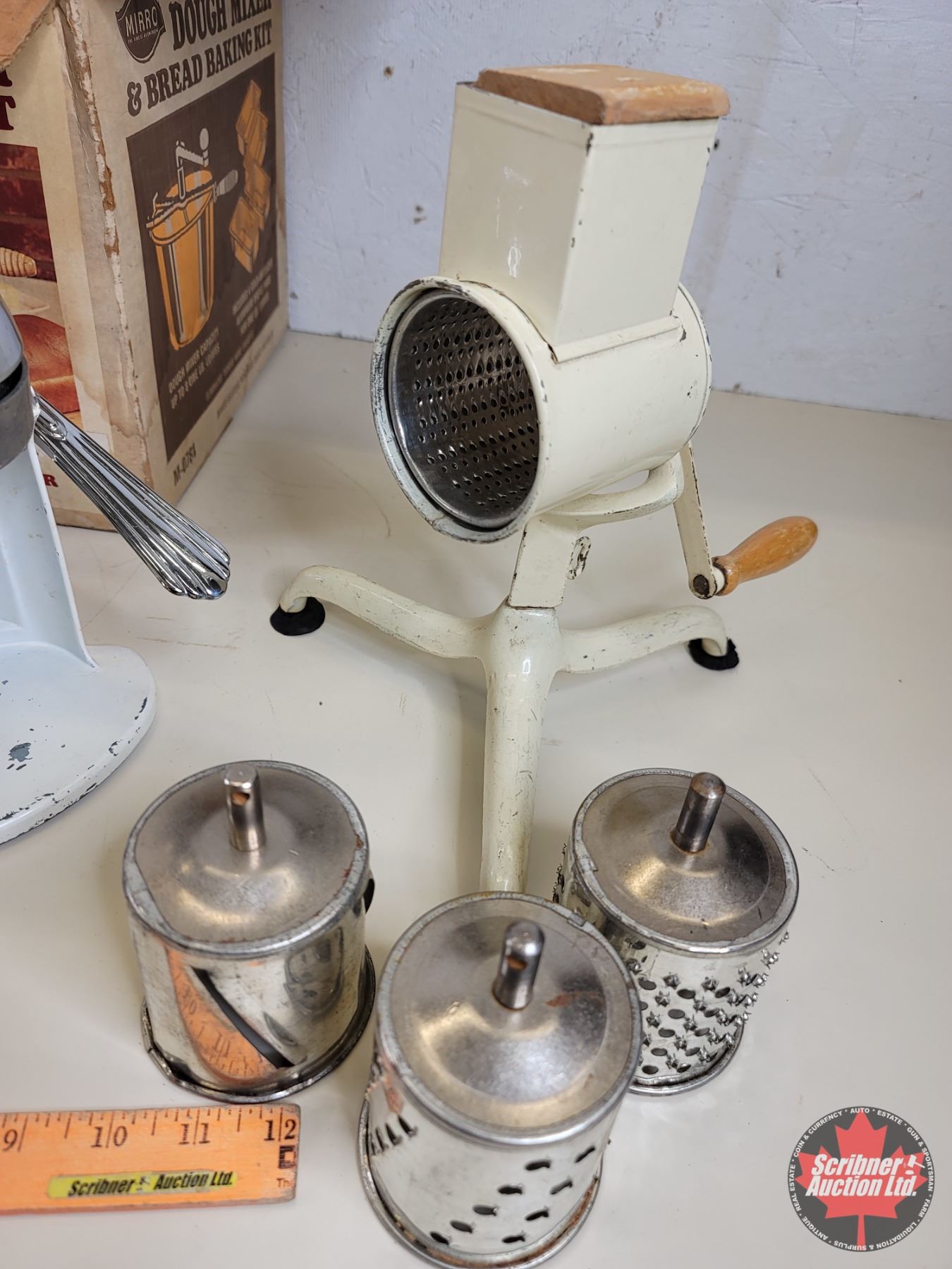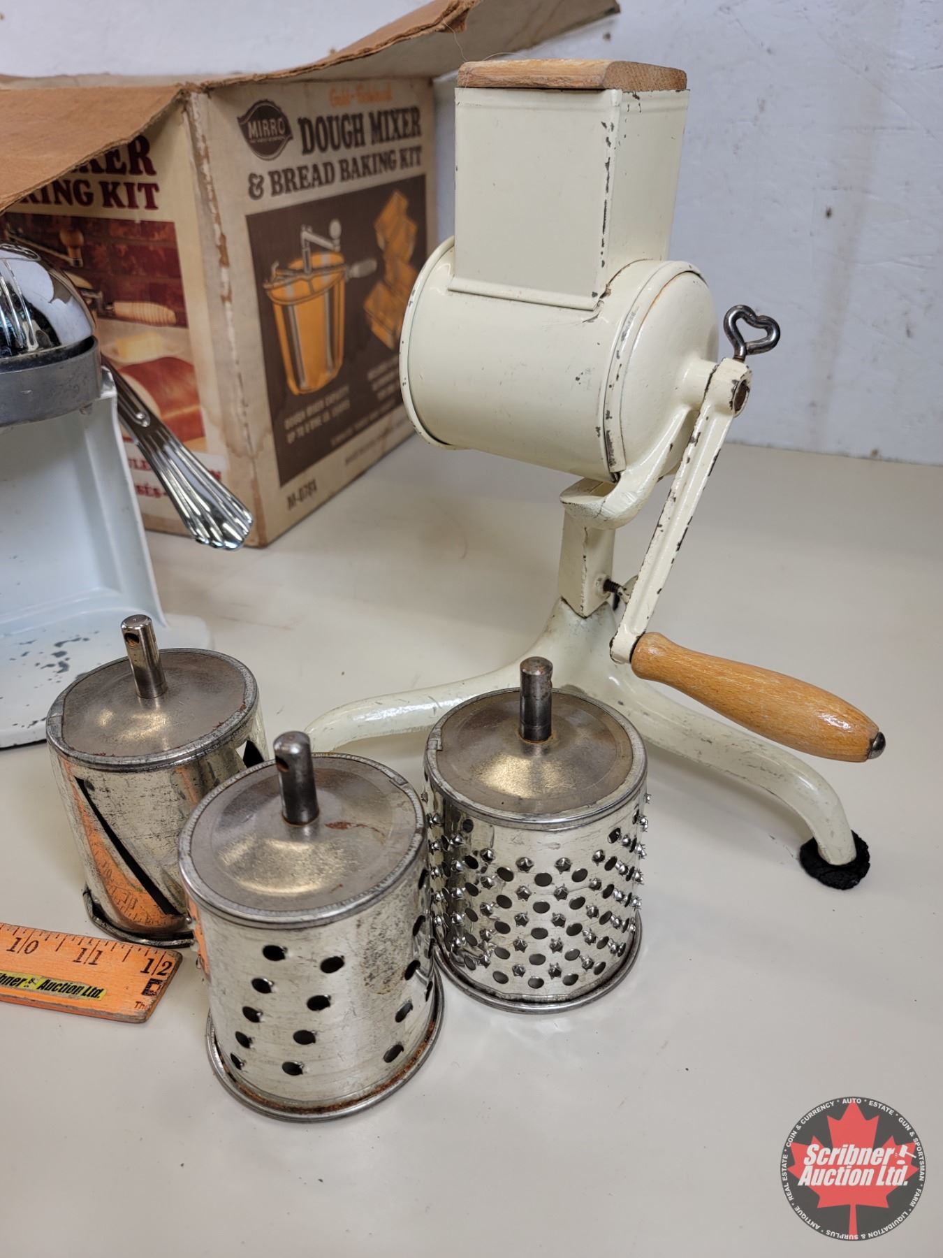 Vintage Kitchen Grouping : Kitchen Crank Grinder/Shredder with Inserts; Citrus Press; Egg Cooker ; Dough Mixer/Bread Baking Kit w/Orig Box, etc!! (SEE PICS!)