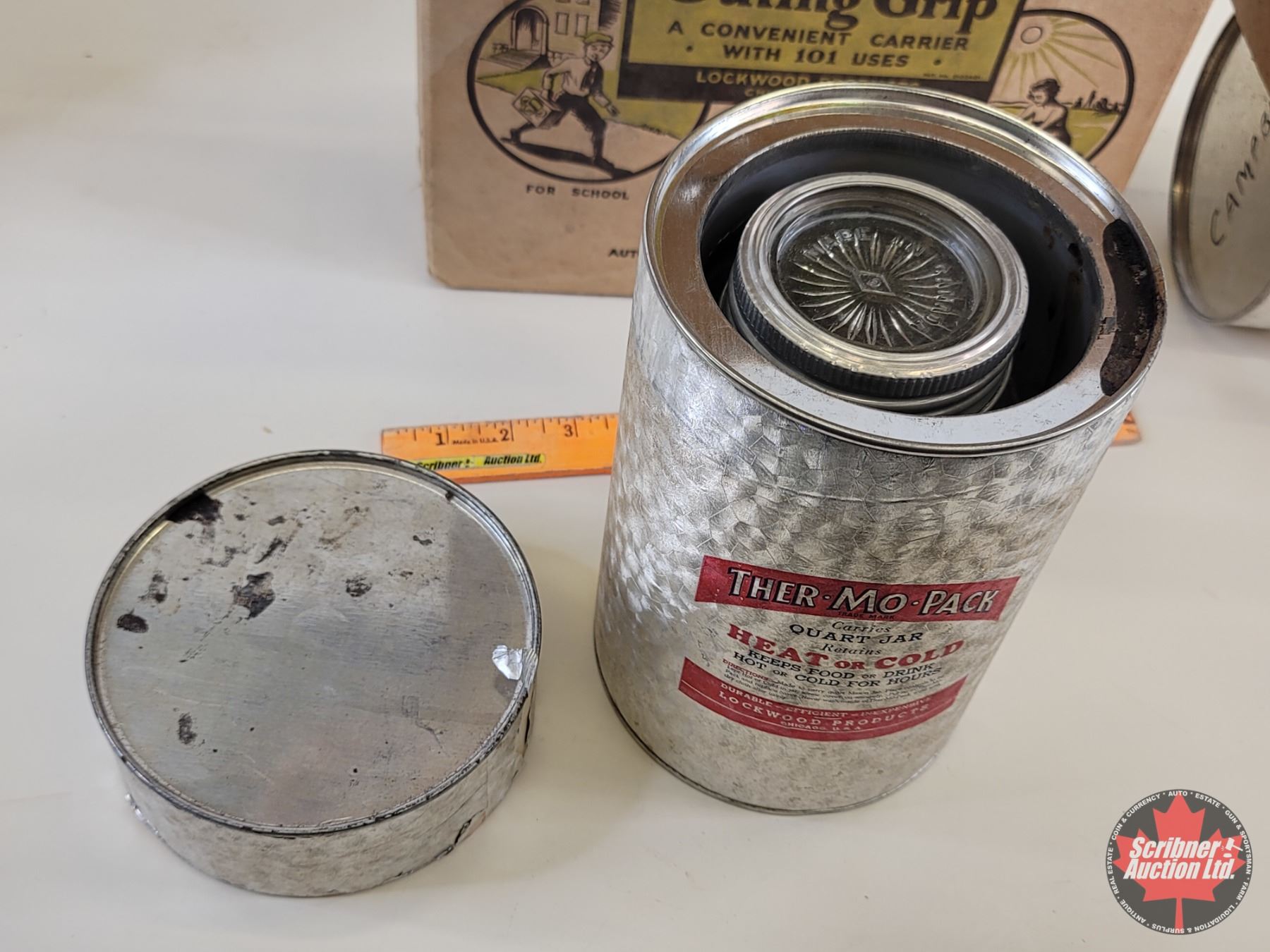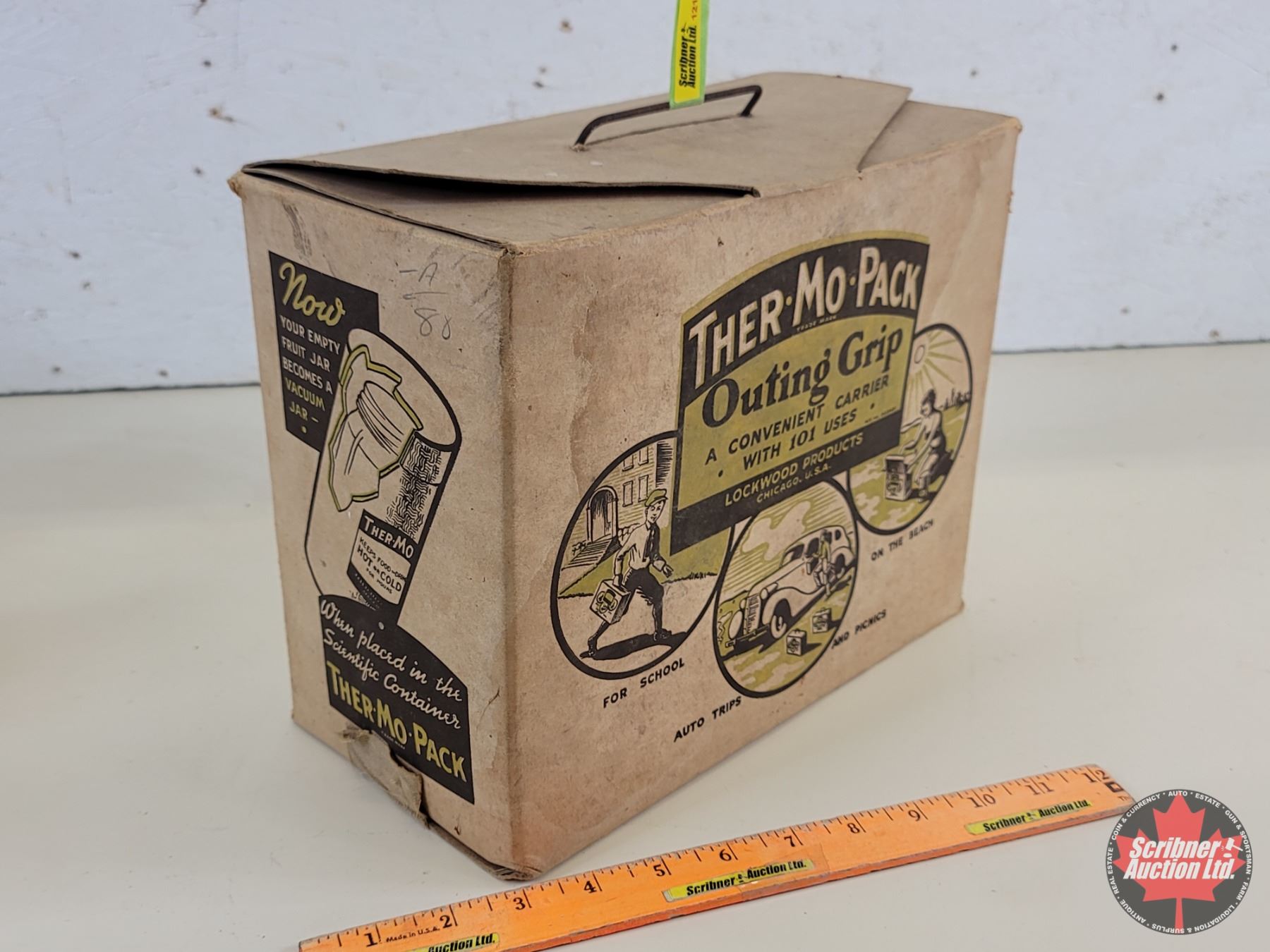 Vintage THER-MO-PACK Outing Grip Carrier w/2 Jars & Ther-Mo-Pack Insulator Canisters (Box Measures: 9"H x 11-1/4"W x 5-3/4"D) (SEE PICS!)