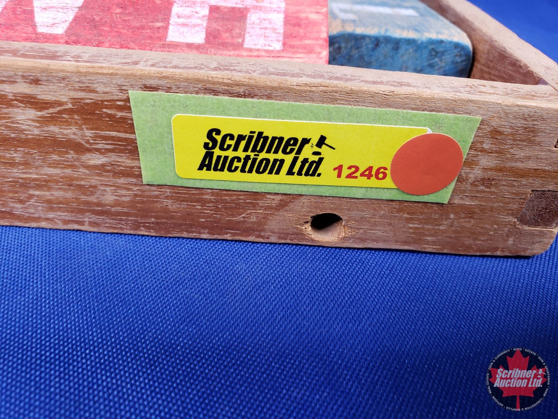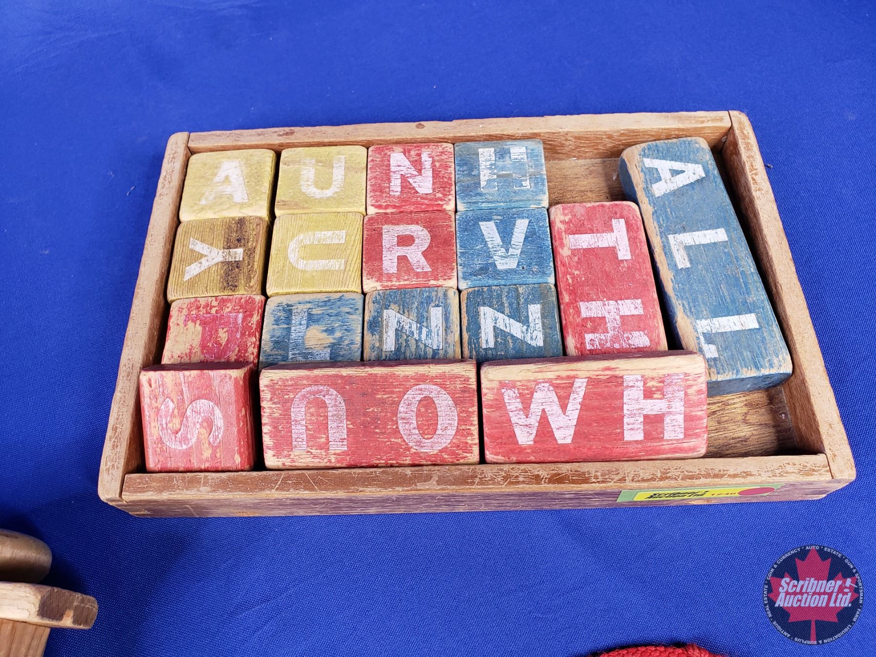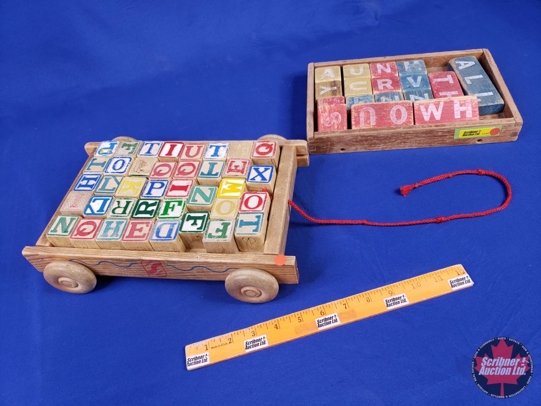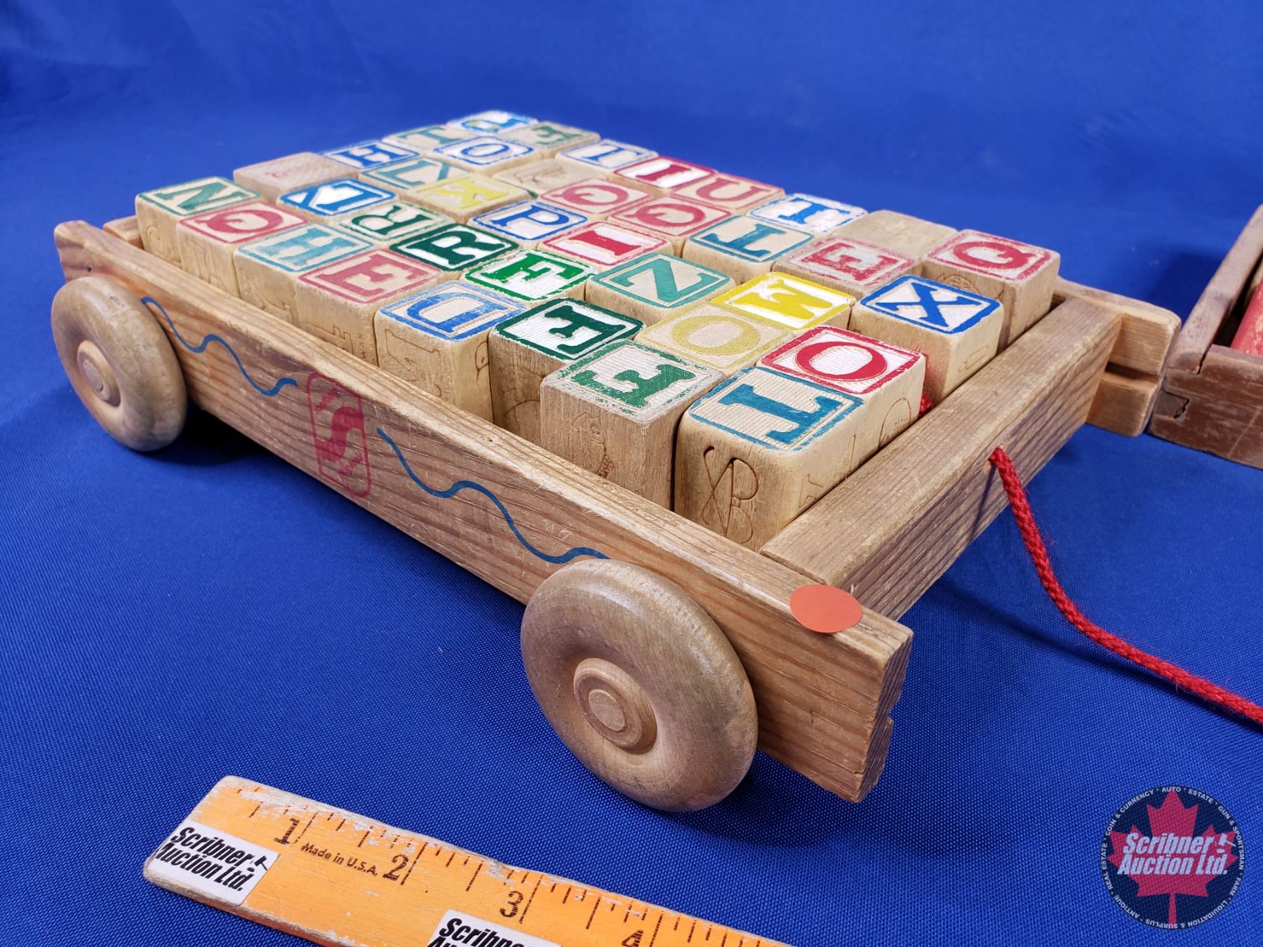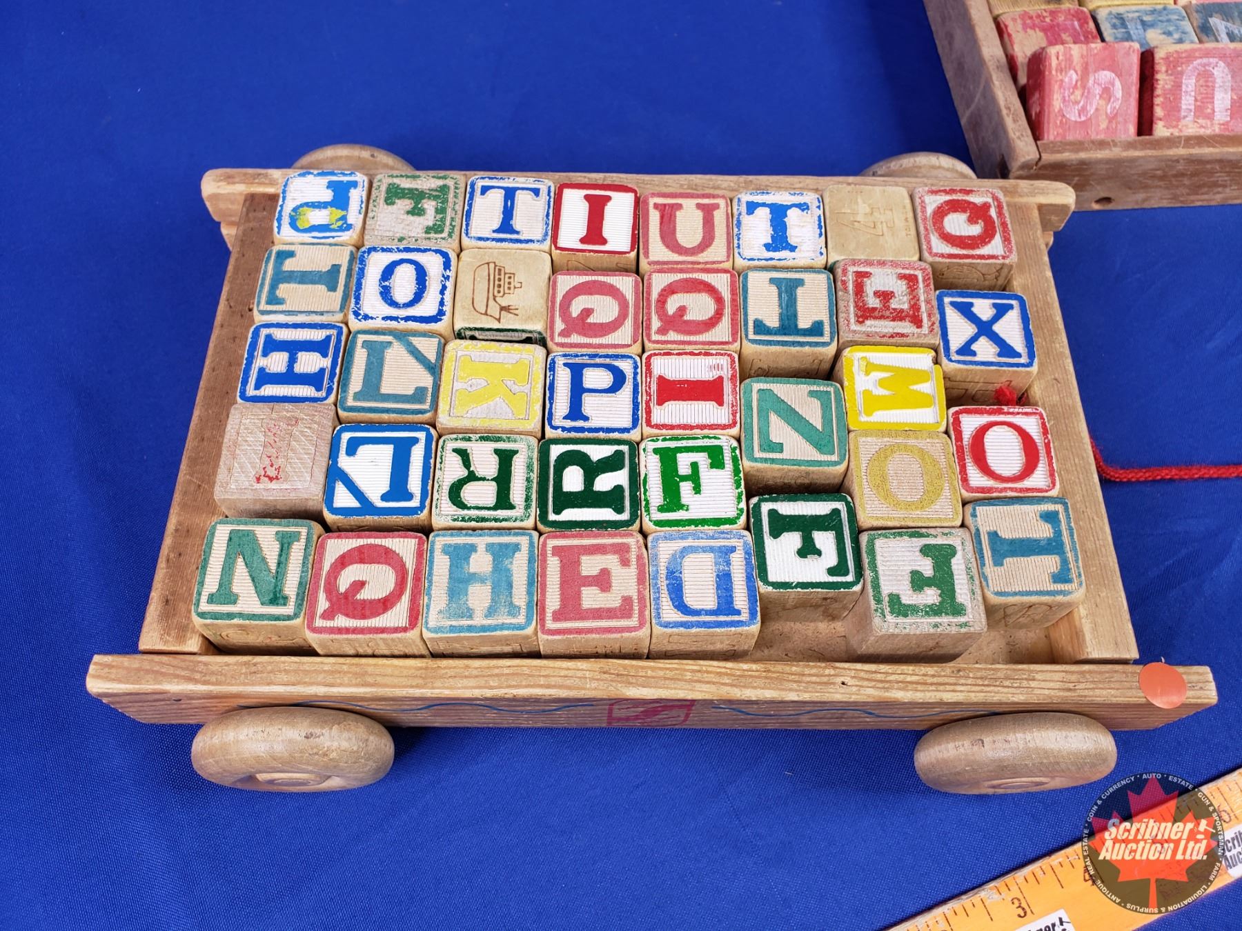 Vintage Wooden Alphabet Blocks (2 Varieties) (One Set in Pull Wagon) (4"H x 9"W x 12-1/2"D) (SEE PICS!)