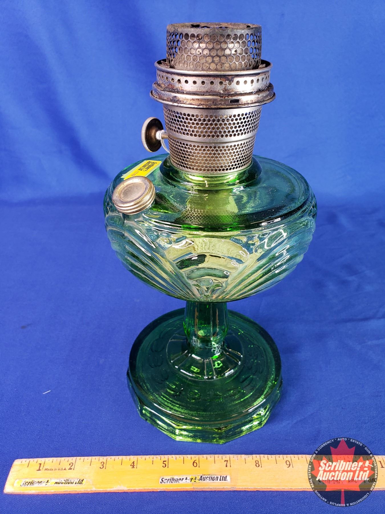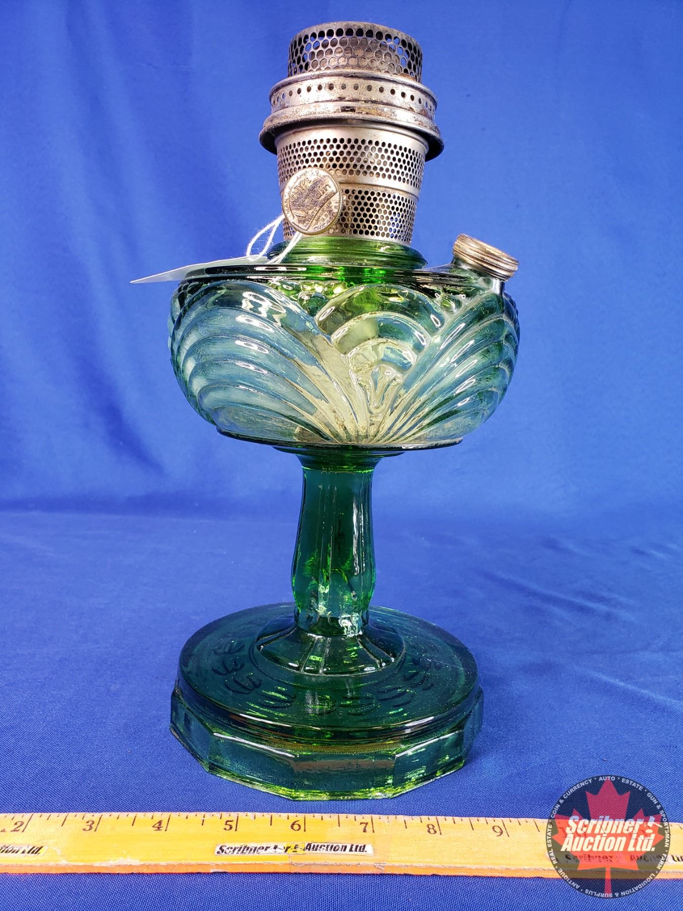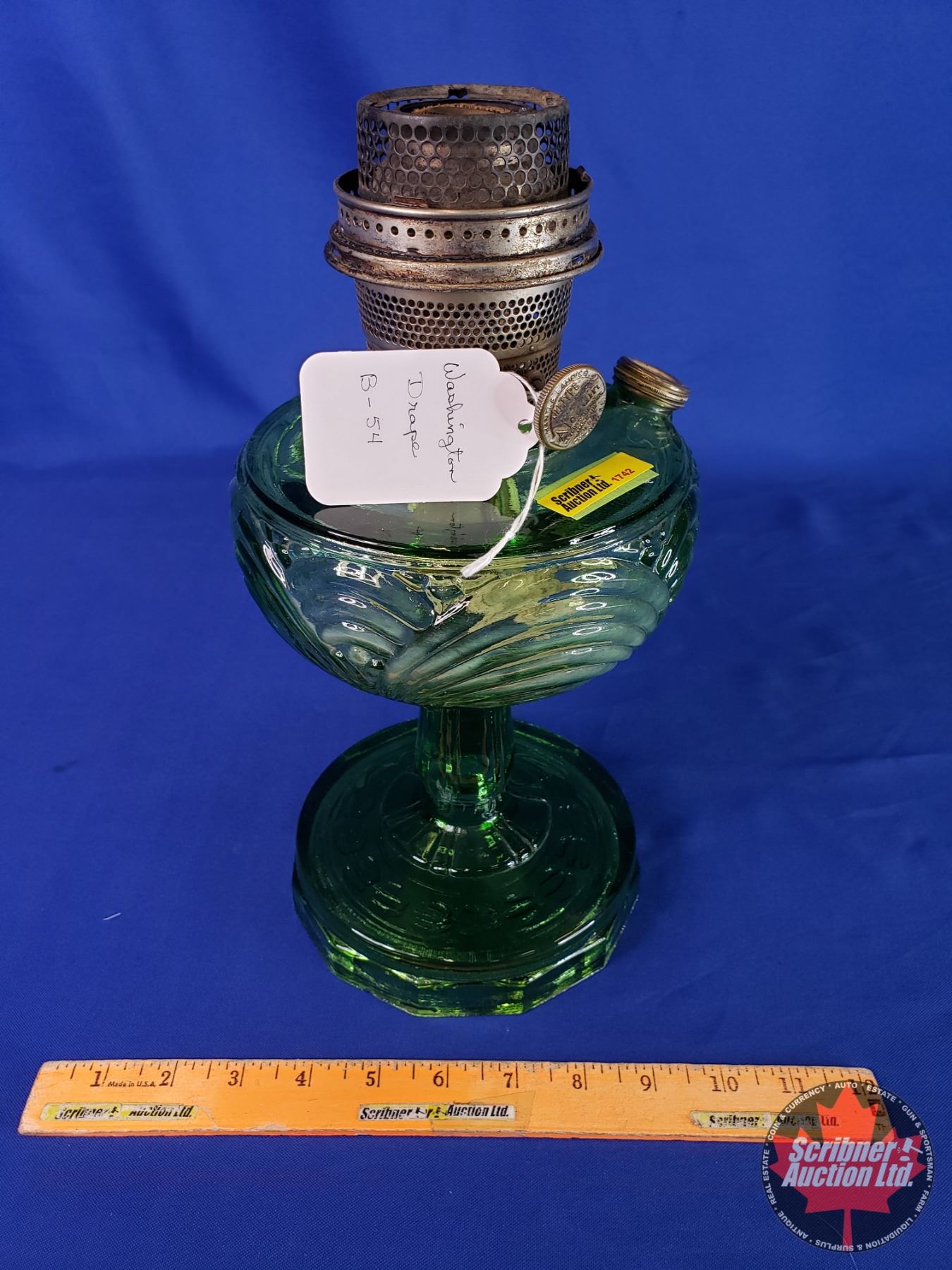Washington Drape Oil Lamp - Green Glass Pedestal Base/Font - Model B Aladdin Burner (No Chimney) (13"H) (SEE PICS!)