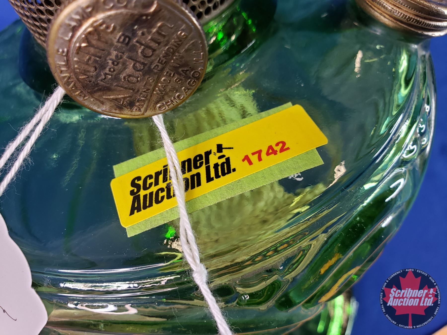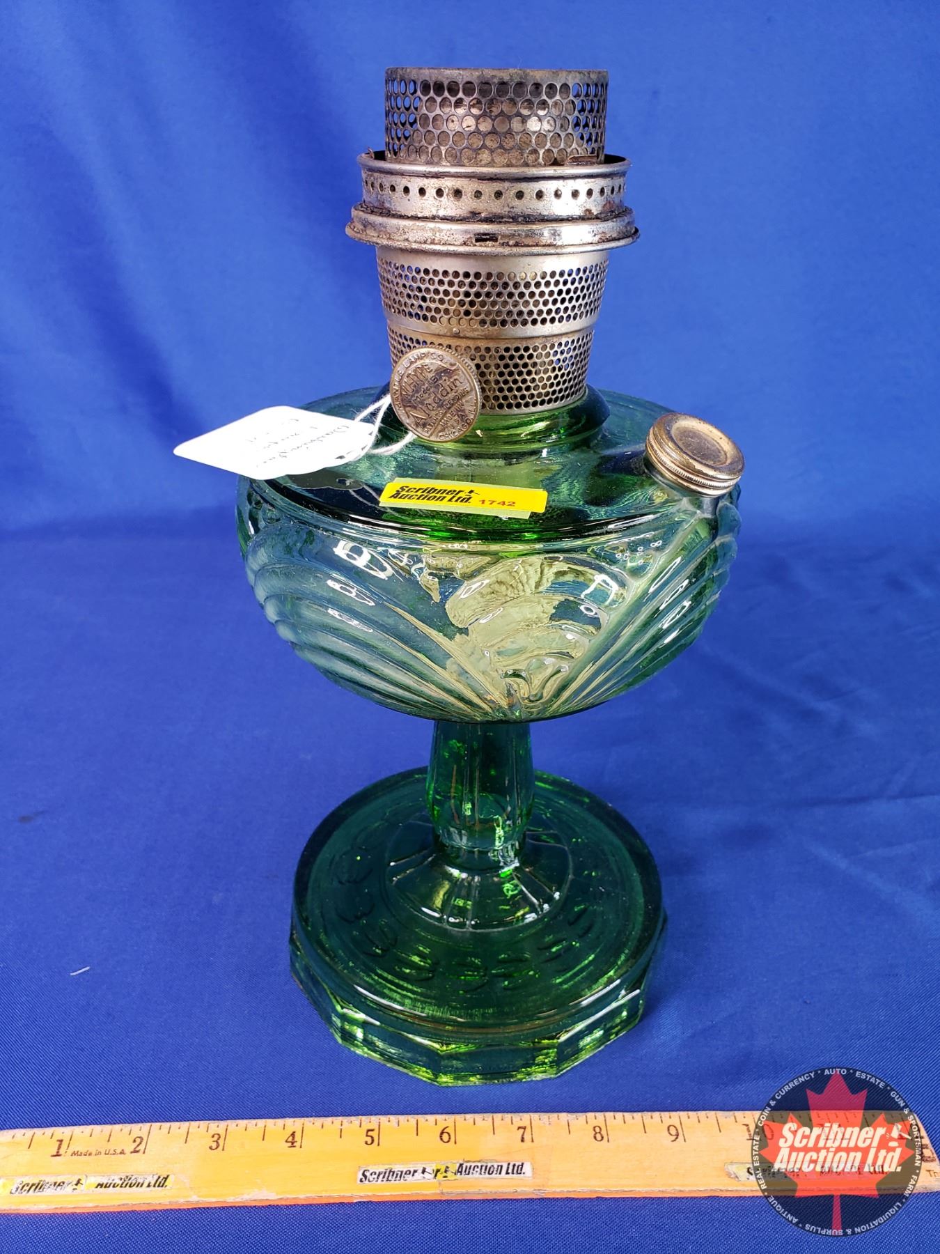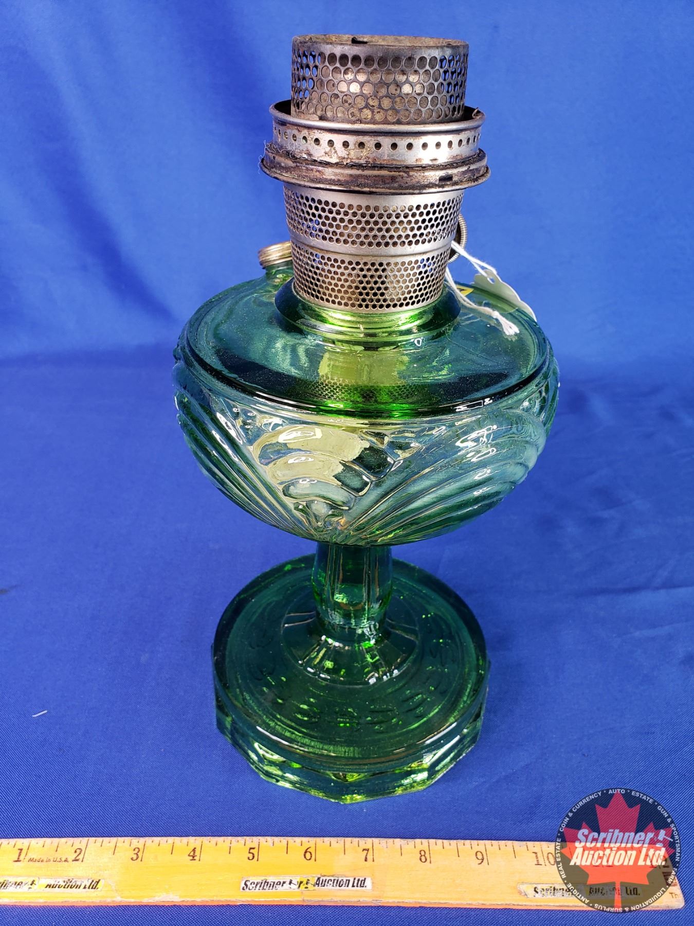 Washington Drape Oil Lamp - Green Glass Pedestal Base/Font - Model B Aladdin Burner (No Chimney) (13"H) (SEE PICS!)
