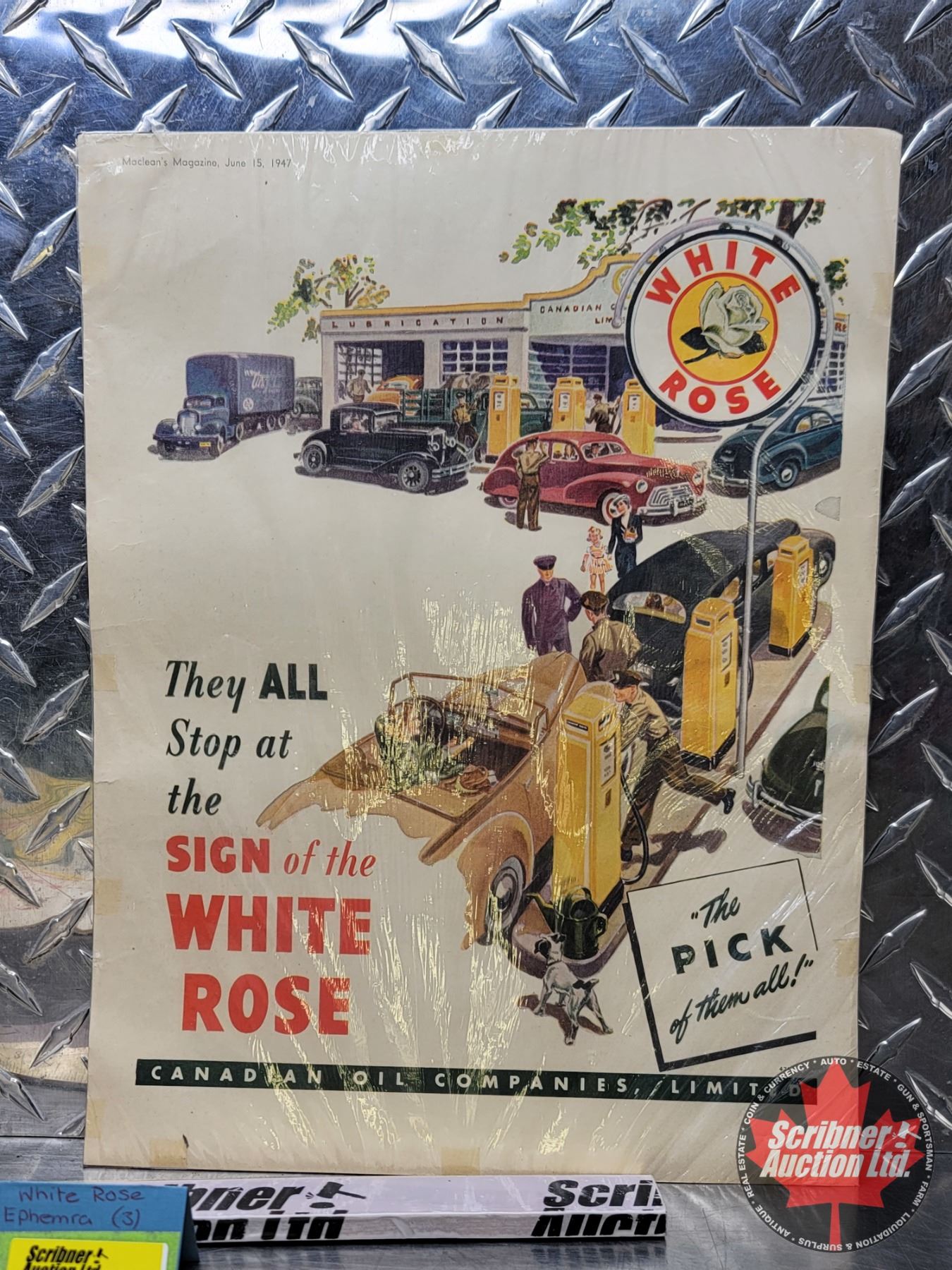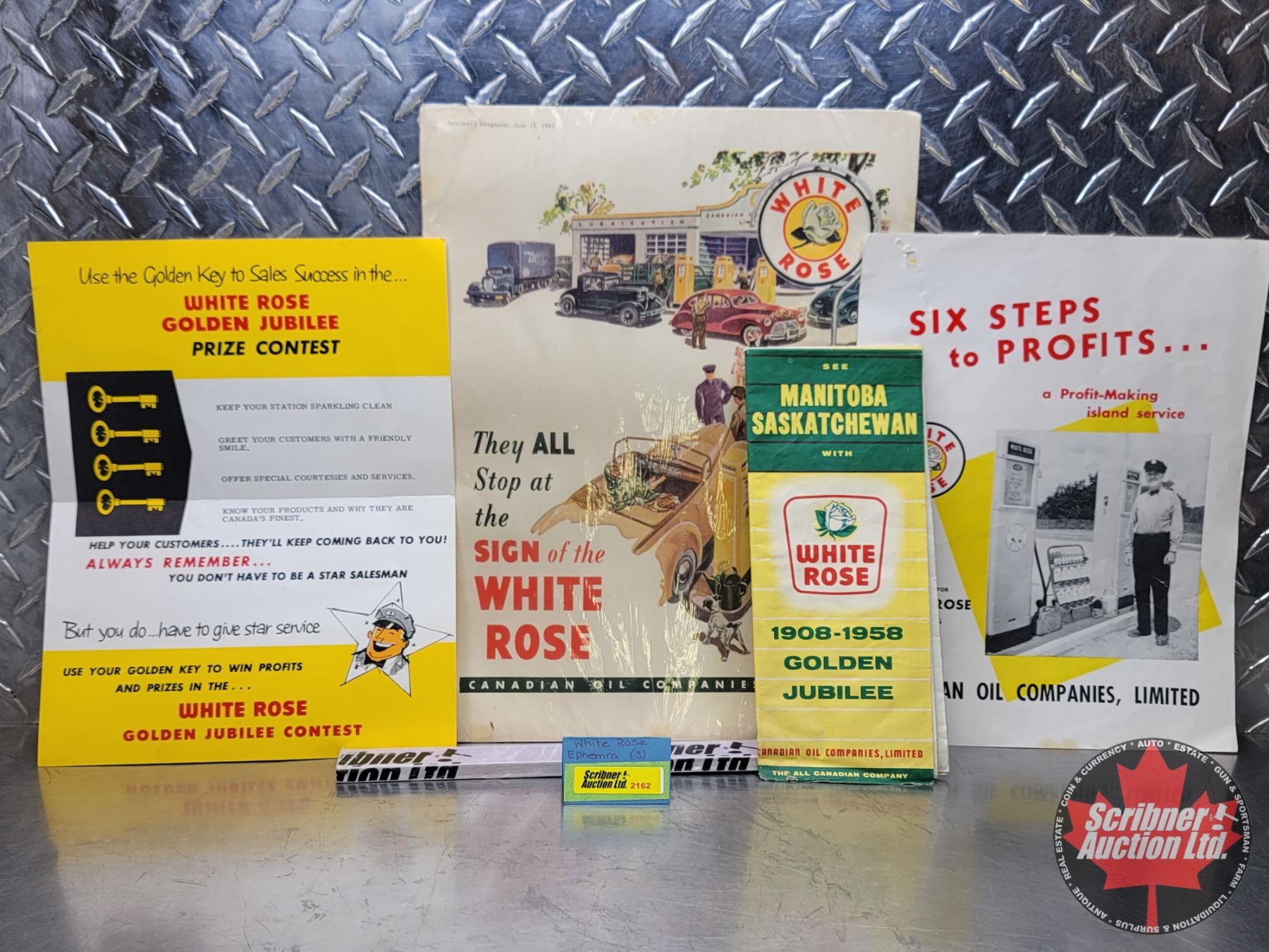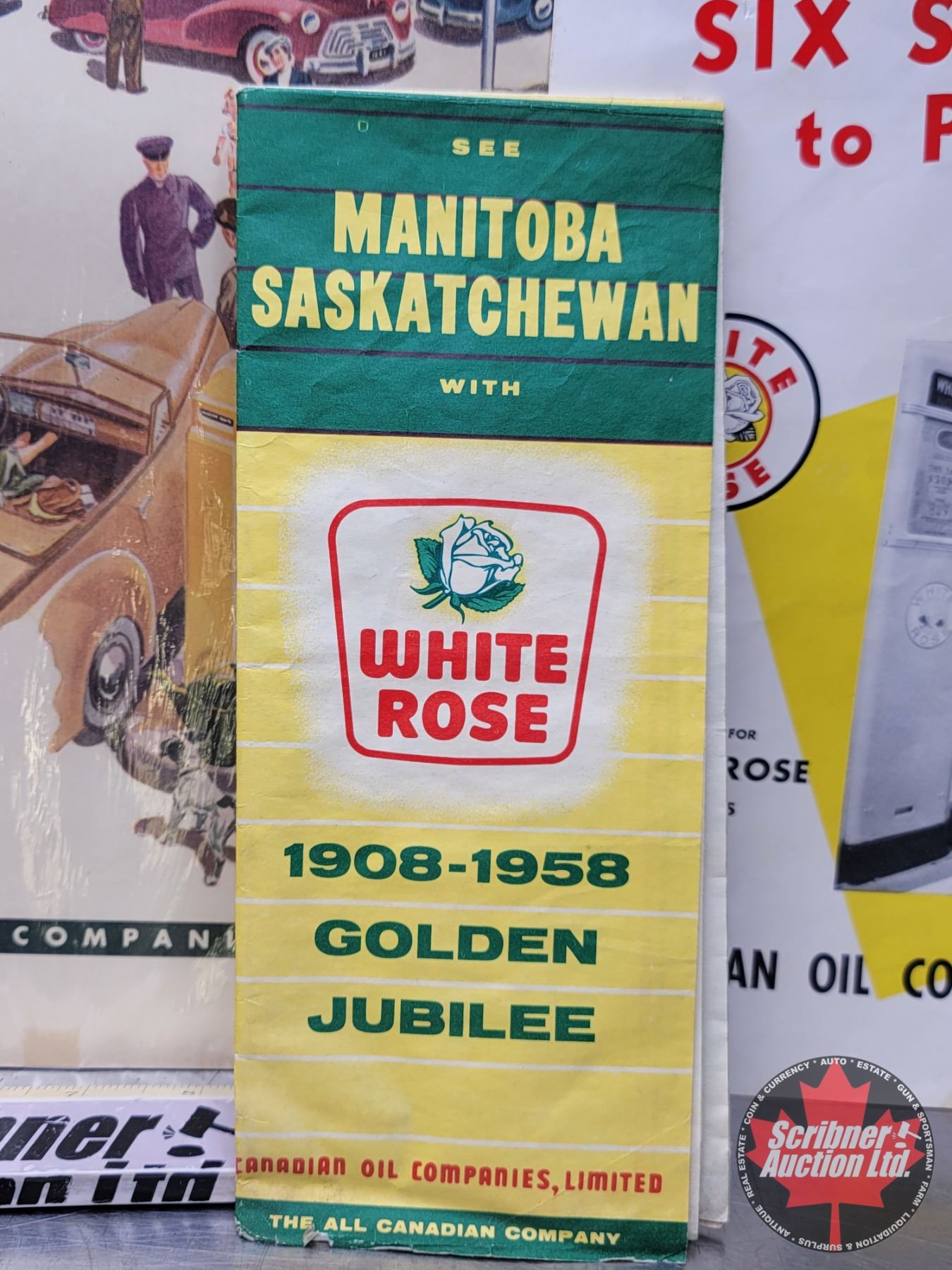 White Rose Ephemera : 1958 Road Map (Manitoba & Saskatchewan), 1947 Magazine Ad, Dealer Only Brochure & 1958 Golden Jubilee Dealer Only Brochure (Magazine Ad : 13-1/2"H x 10-1/4"W) (SEE PICS!)