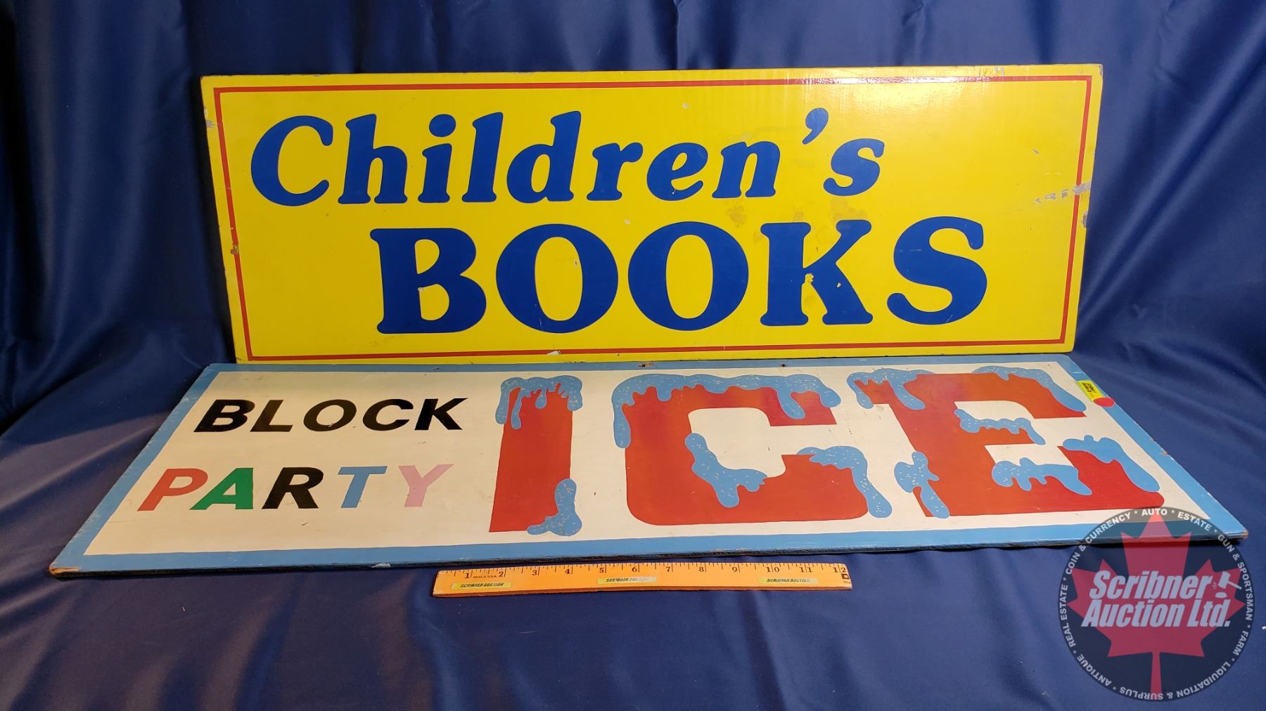 Wood Advertising Signs (2) "Block Party Ice" & "Toys/Children's Book" (Both: 13"H x 36"W)