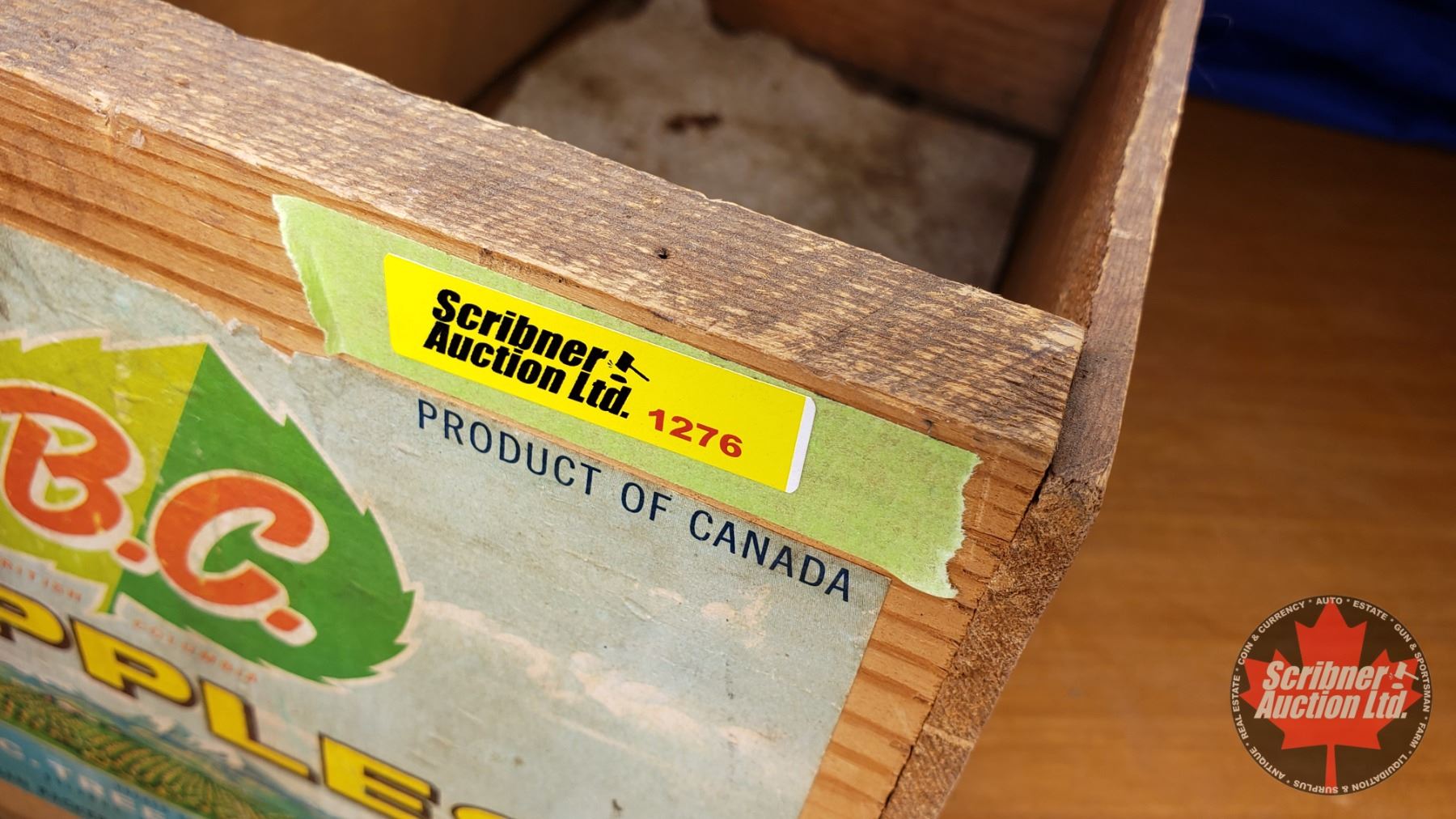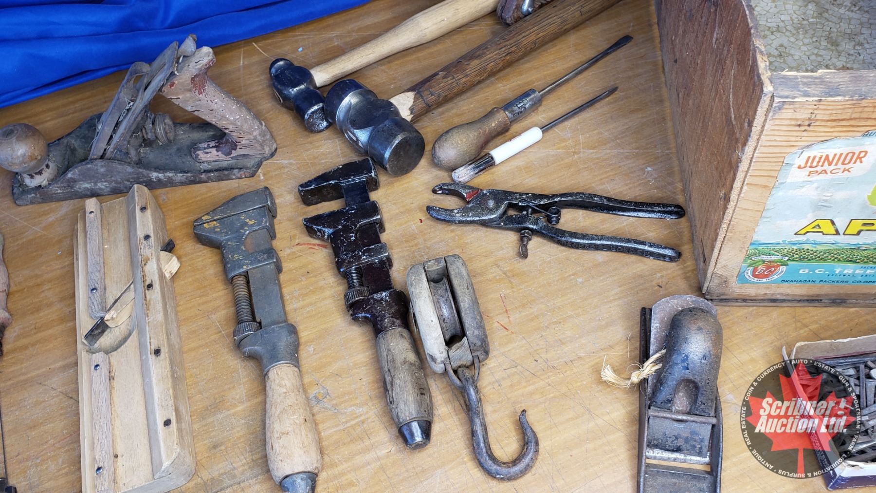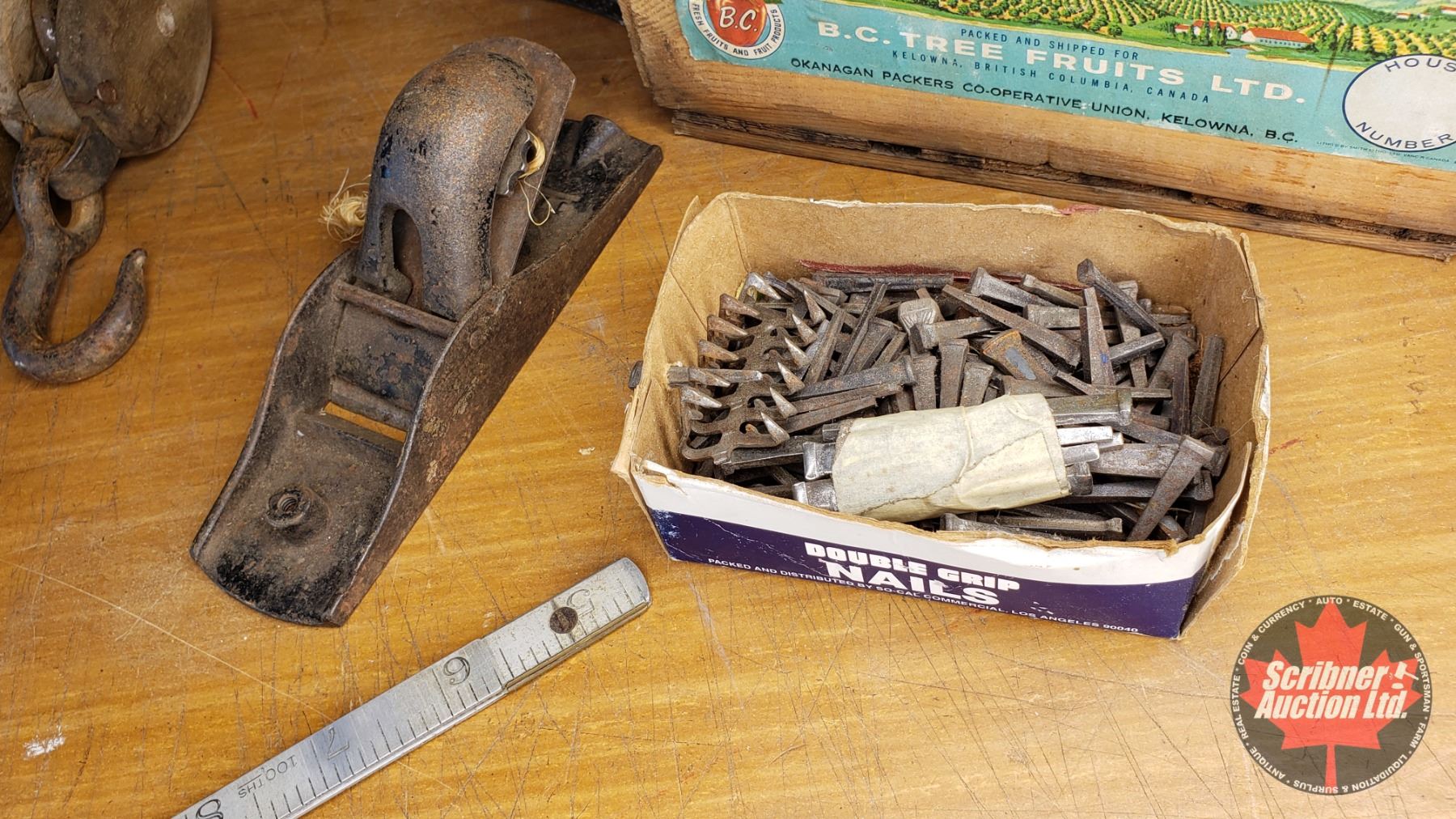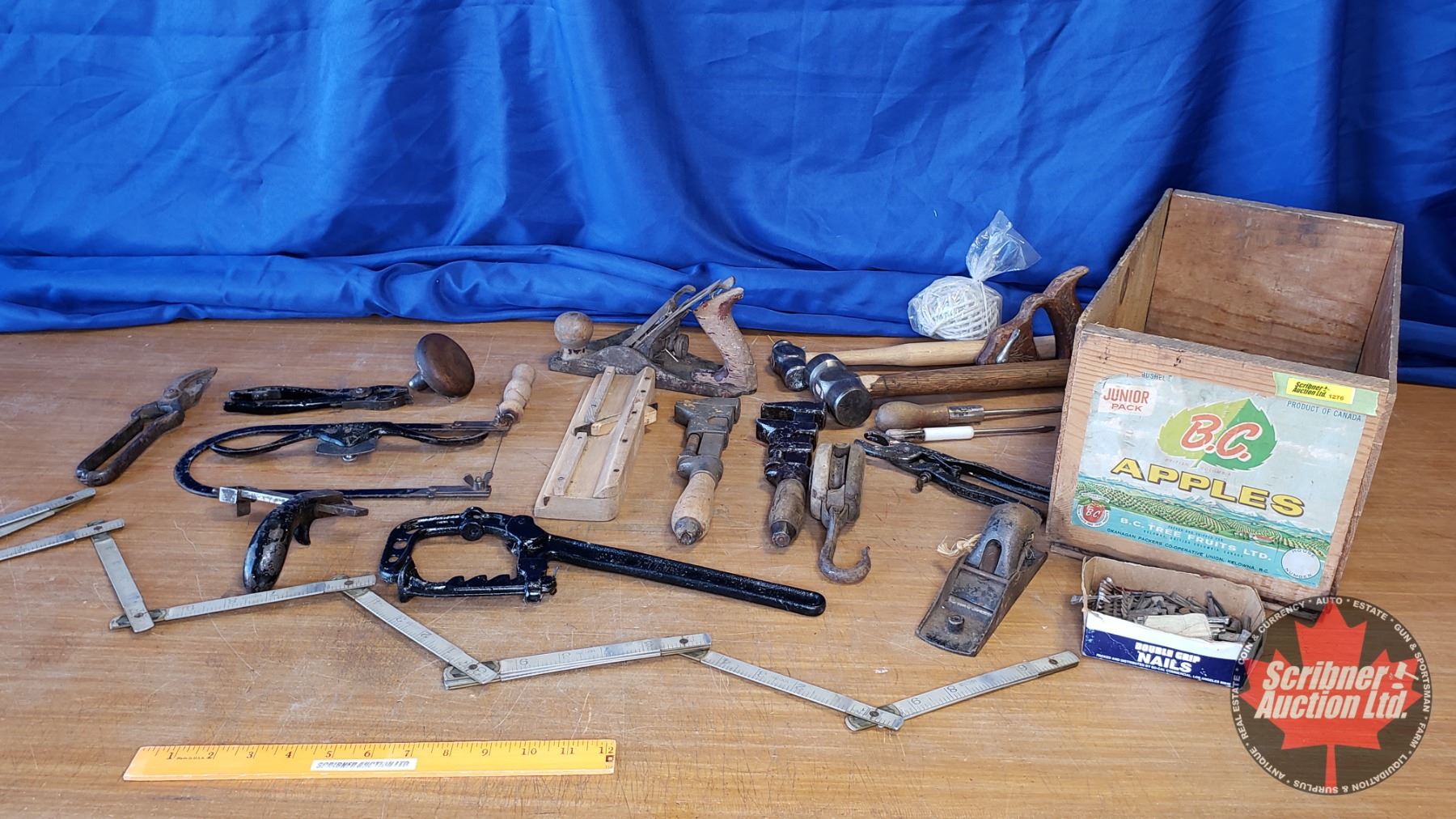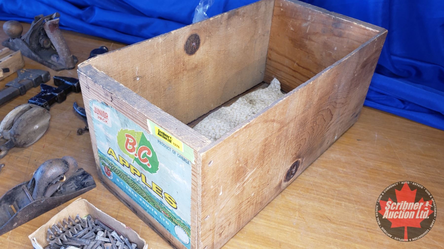 Wood Apple Box w/Tools (Adjustable Wrenches (2), Planes, Hammers, Square Nails, The Springfield Tire Tool, etc