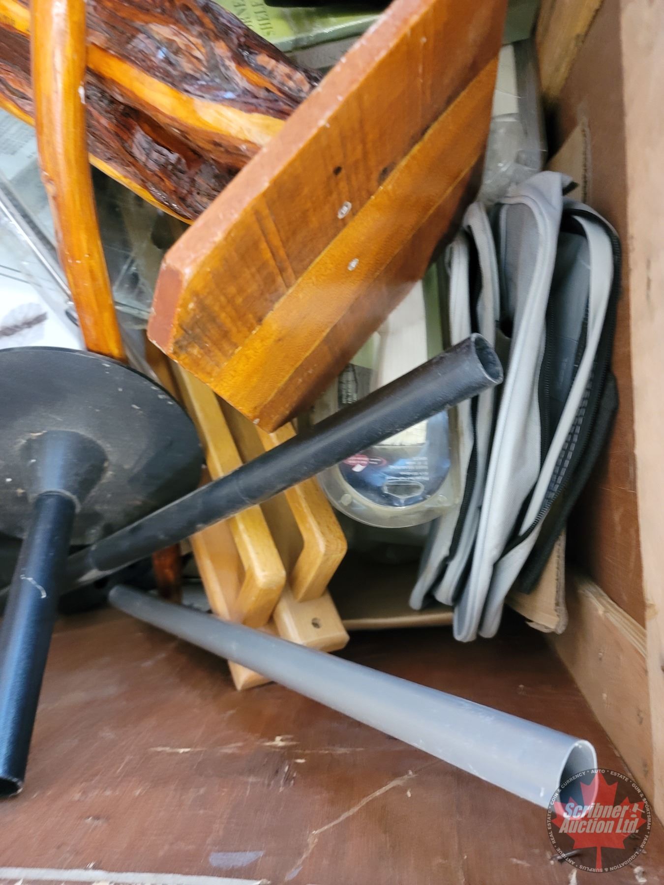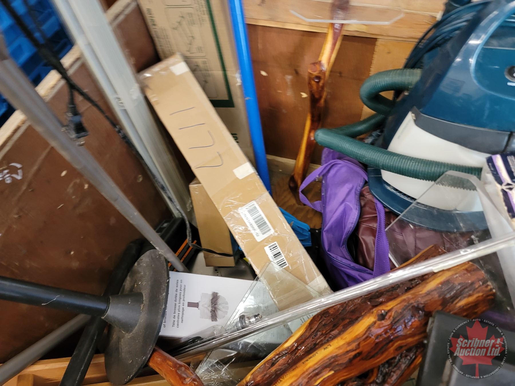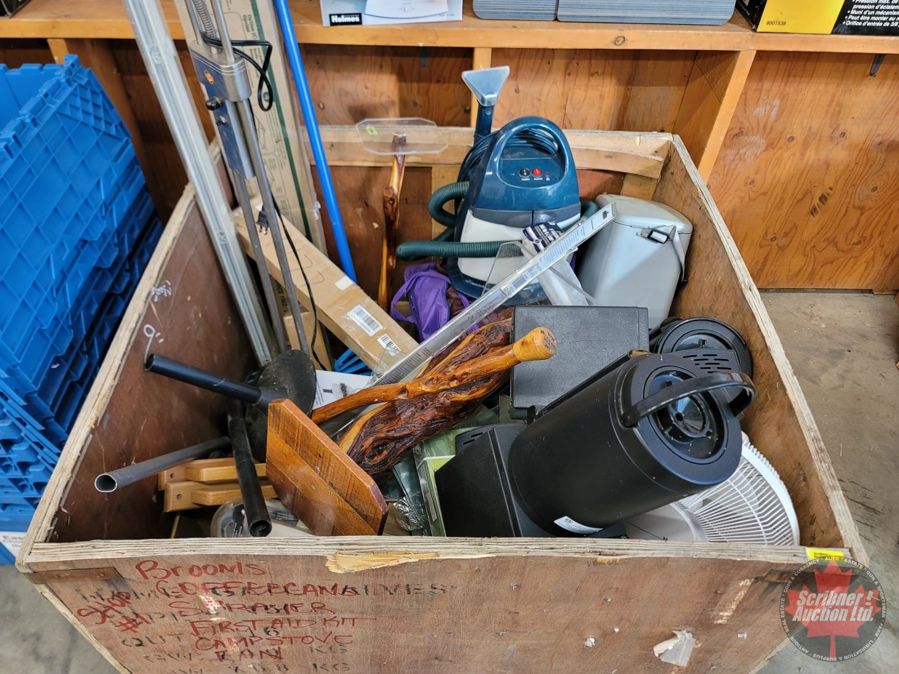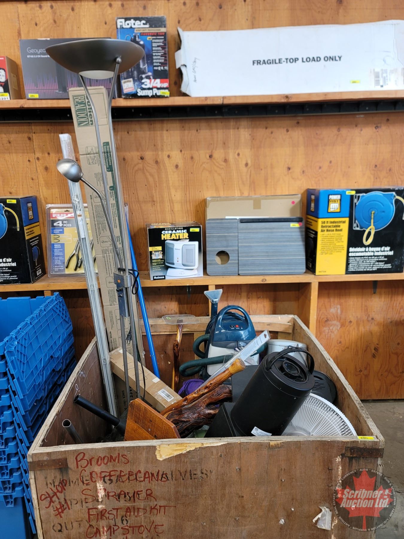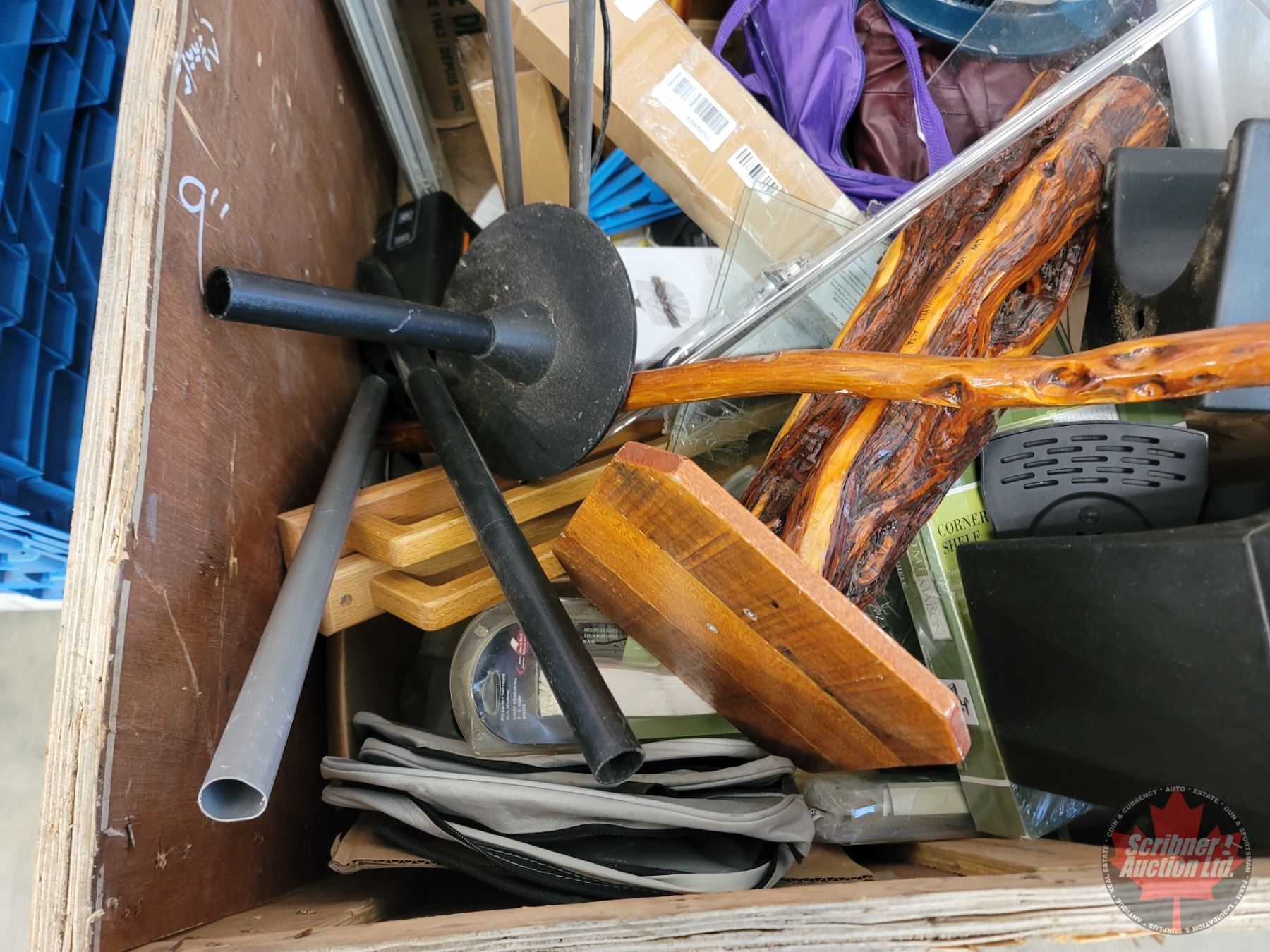 Wooden Crate Lot w/Large Variety of Home Decor & Household Used Products including Bed Frame, Blinds, Floor Lamp, Fan, Glass Corner Shelves, etc